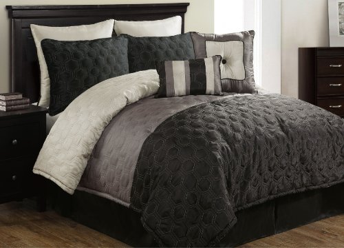 Comforter is product of blocks of fabric in Black/Silver.Machine Washable. Comforter Measures: King-110"x96"; Queen-92"x96".This amazing comforter set has hexagon stitching all through the set..Set Includes: Comforter, Bedskirt, 2-Reversible Shams, 2-Reversible Euros, 2-Decorative Pillows. This magnificent comforter set has hexagon stitching right through the set. Comforter is fabricated from blocks of cloth in three different shades. Set Includes: Comforter, Bedskirt, 2-Reversible Shams, 2-Reversible Euros, 2-Decorative Pillows, . Machine Washable..
